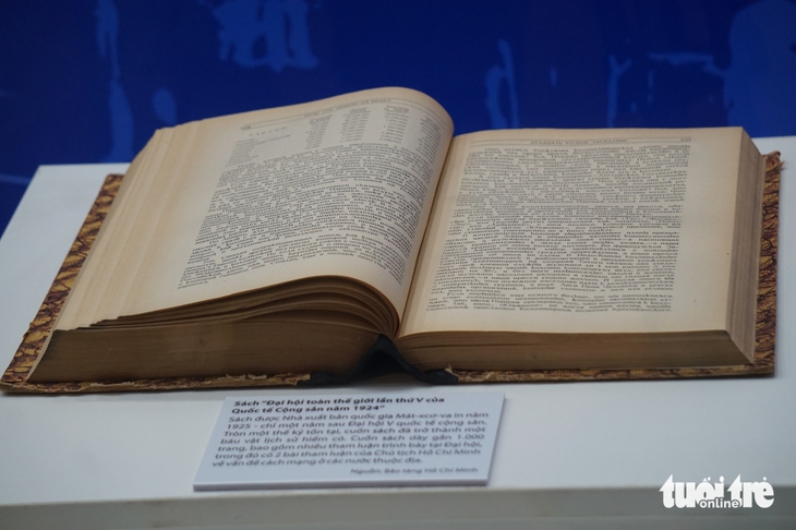 Cuốn sách ‘Đại hội toàn thế giới lần thứ V của Quốc tế Cộng sản năm 1924” gần 1.000 trang, được xuất bản vào năm 1925, trong đó có hai bài tham luận của Nguyễn Ái Quốc, lần đầu được giới thiệu tới công chúng ở Bảo tàng Hồ Chí Minh.