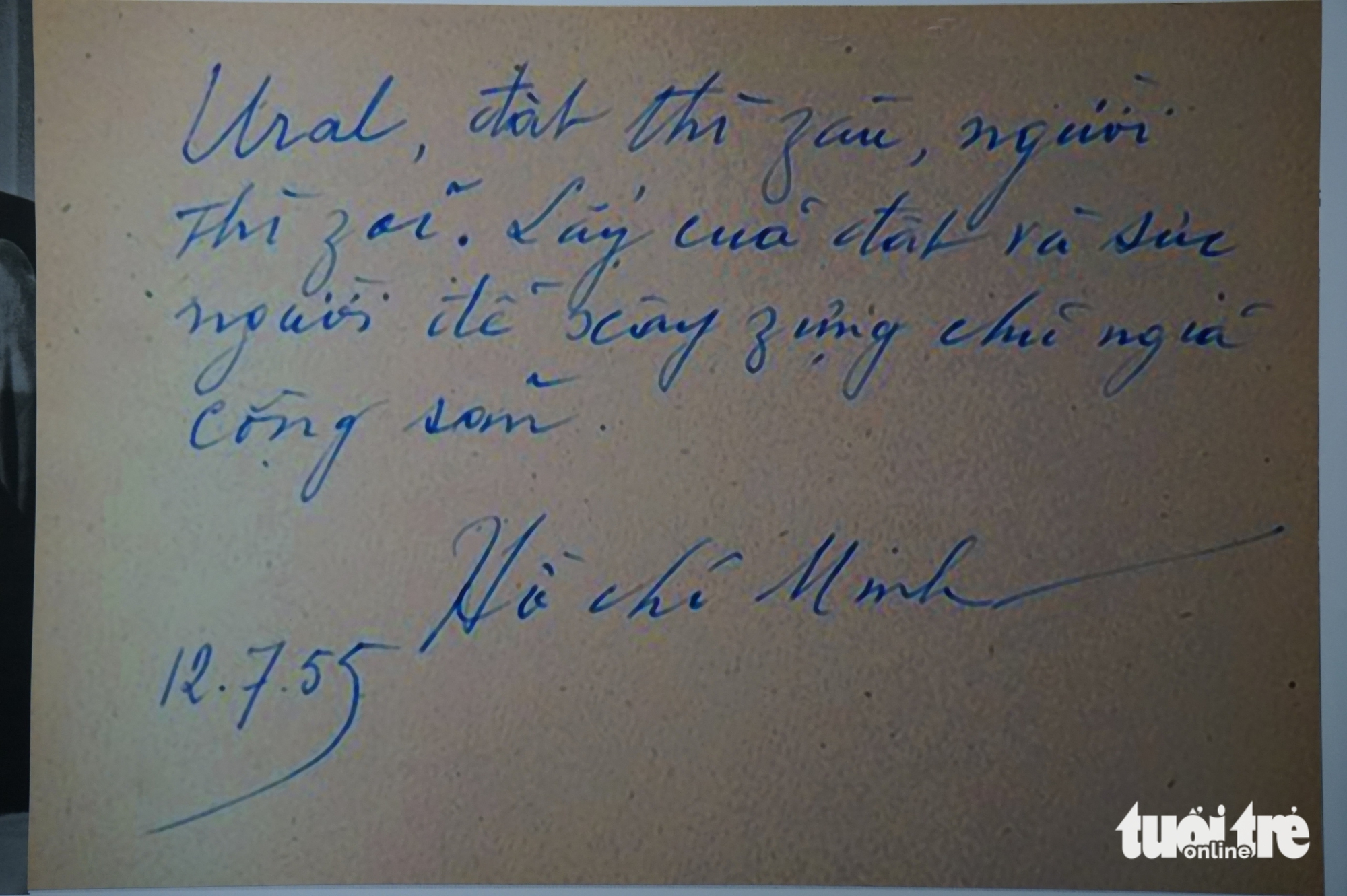Dòng lưu bút của Chủ tịch Hồ Chí Minh trong Sổ cảm tưởng khách danh dự của Bảo tàng Địa chất Ural, vừa được tặng cho Bảo tàng Hồ Chí Minh hồi tháng 7-2025 — Ảnh: T.ĐIỂU